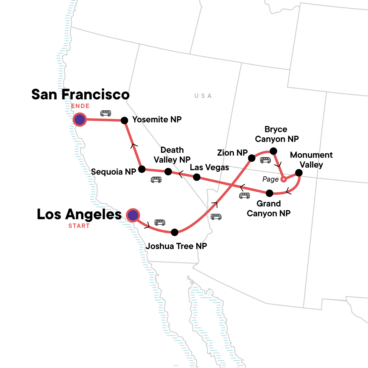 Manche nennen es Urlaub. Wir nennen es das Abenteuer deines Lebens! Mach mit uns eine 16-tägige Reise durch sieben der besten Nationalparks im Westen der USA. Von uralten Josuabäumen bis zur Golden Gate Bridge gibt es so viel zu sehen und zu tun, dass Langeweile für dich ein Fremdwort werden wird. Überquere die Sandsteinriesen in Zion, wandere zwischen den Hoodoos im Bryce Canyon, fühl dich unglaublich klein am Rand des gewaltigen Grand Canyons, besuche im Death Valley den tiefstgelegenen Ort der USA, sieh die höchsten Bäume der Welt im Sequoia-Nationalpark und wandere durch die surrealen Landschaften im Yosemite Valley. Mit der perfekten Mischung aus Städten und Natur könnte das genau die Auszeit vom Alltag sein, die du suchst