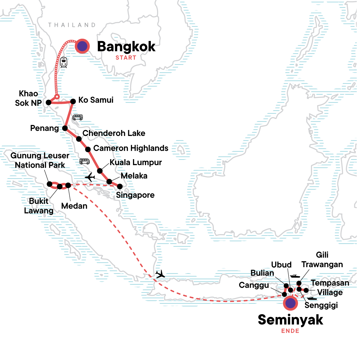 Get ready for the ultimate Southeast Asia adventure-spanning four countries, countless flavours, and nonstop vibes. Kick things off in Thailand with epic beaches and buzzing night markets, then cool down in Malaysia's Cameron Highlands before diving into Singapore's food scene and skyline views. From there, it's on to Indonesia's wilder side: track orangutans in Sumatra, hike volcanoes in Bali, soak in hot springs, and chill out in Gili T. With homestays, jungle treks, cultural eats, and beach bliss, this trip is your fast track to the best of the region-on a budget and with a squad just as stoked as you.