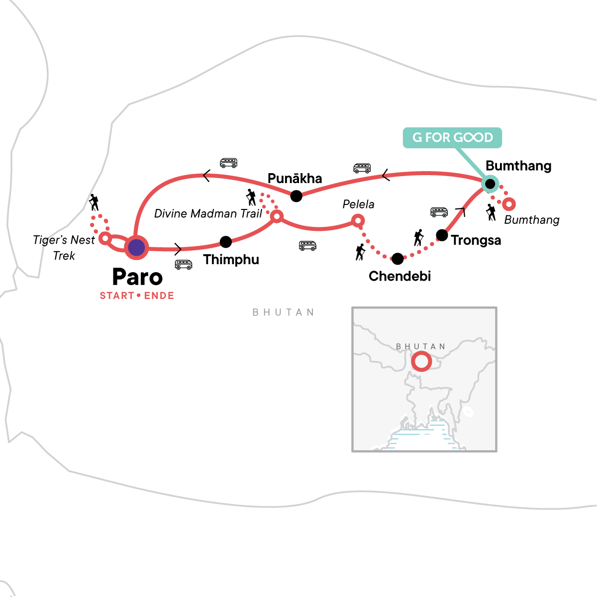 Stell dir nur mal vor, das glücklichste Land der Welt auf einem Weg zu erkunden, der bereits hunderte Jahre lang von Königen, Mönchen und Händlern genutzt wurde. Willkommen auf dem Trans Bhutan Trail! Bis in die 1960er Jahre war er der einzige Weg durch das gebirgige Königreich Bhutan. Und jetzt kannst du ihn erstmals seit 60 Jahren selbst gehen. Auf dieser 12-tägigen Reise wanderst du auf den besten Abschnitten dieses geschichtsträchtigen Weges und lernst das alltägliche und spirituelle Leben in den schönsten Teilen Bhutans kennen. Von Westen nach Osten wanderst du entlang von Gebirgspässen und durch grüne Flusstäler und Dörfer wie aus einer anderen Zeit und hast reichlich Gelegenheiten, unterwegs die Geschichte, Kultur und Bräuche des Landes kennenzulernen. Der Trans Bhutan Trail ist voller Magie und er wartet nur darauf, von dir entdeckt zu werden.