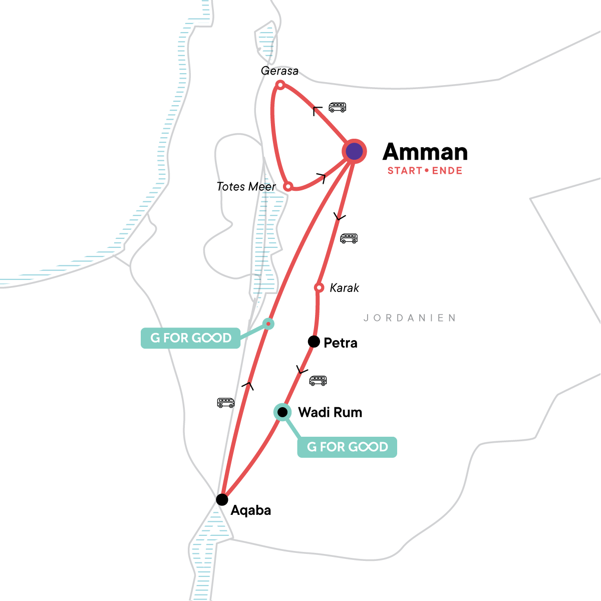 Dein Local-Living-Moment: Übernachtung im Beduinenlager, Wadi Rum. Geführte Tour durch Gerasa. Besuch des Toten Meeres. Besichtigung des Madaba-Mosaiks und Nebo. Geführte Besichtigung der Burg bei Karak. Führung durch Petra. Jeep-Ausflug zum Wadi Rum. Aufenthalt am Roten Meer. Alle Eintritte inklusive. Alle Transfers zwischen den Reisezielen sowie zu inbegriffenen Aktivitäten und zurück
