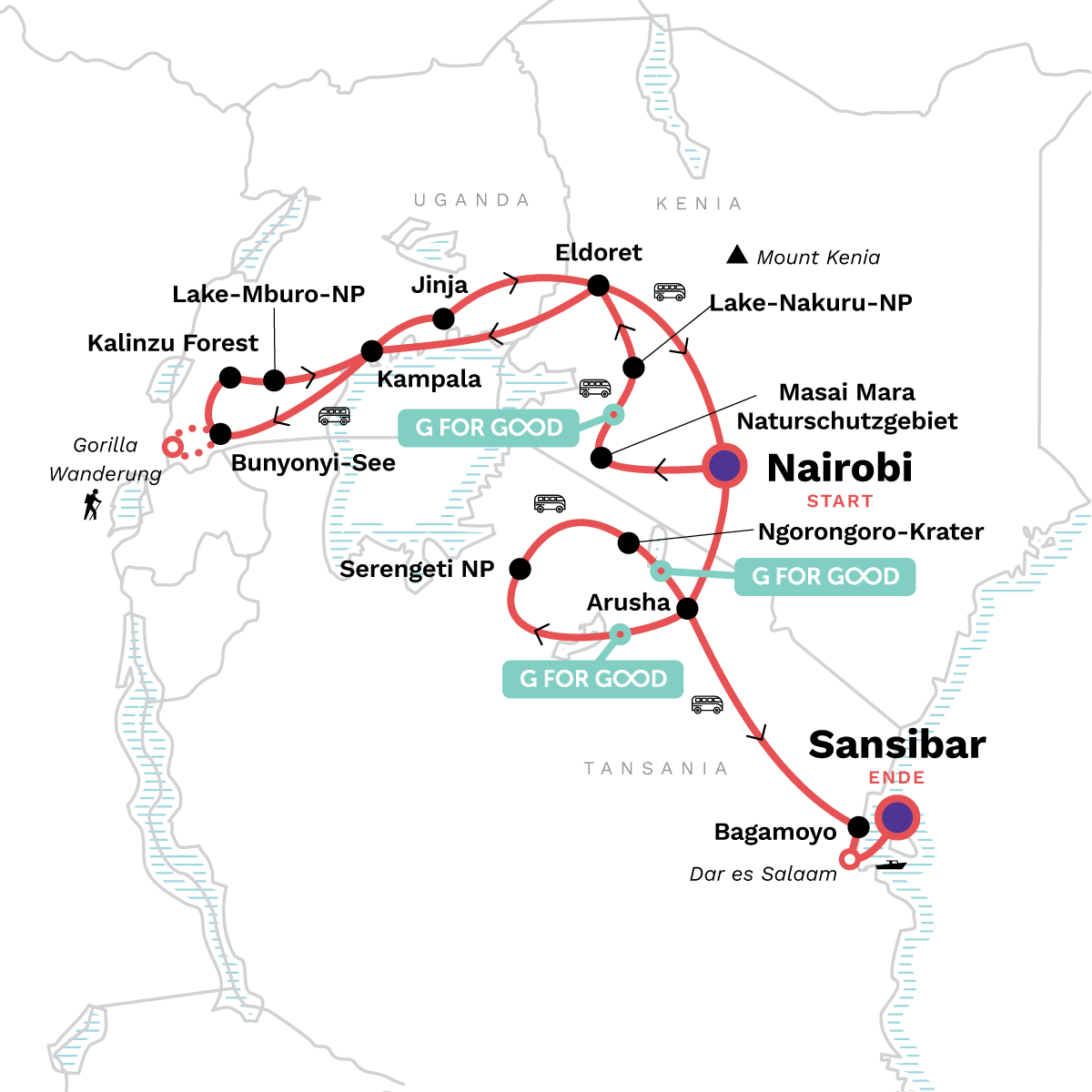 Bitte beachte: The climate in East Africa varies between the dry and rainy season. Please ensure you bring a windproof rain jacket if you are travelling between April & May, October & November