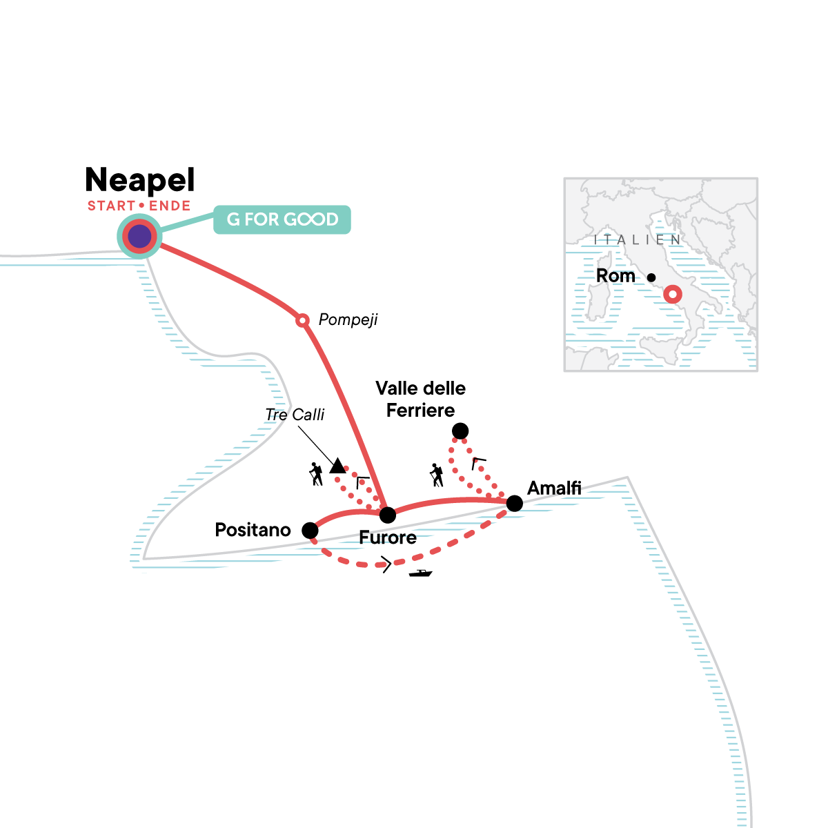 Dein Welcome-Moment: Anreise und Begrüßungstreffen. Guided tour of Pompeii. Organized hikes and excursions from Furore (6 days). Visit to Amalfi. Scenic ferry ride from Positano to Amalfi. Cooking demonstrations at the agriturismo. Transport between destinations and included activities