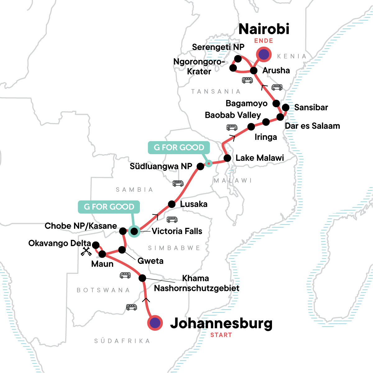 Take off for 27 days and adventure through seven countries on an epic overland journey from Johannesburg to Nairobi. Bump along in the wild savanna of Ngorongoro and the Serengeti on safari drives before going deep into the Okavango Delta by traditional canoe for an overnight bush excursion. Feel the mist of Victoria Falls and smell the fragrant air of Zanzibar's spice plantations. Travel by rugged Lando and camp your way through a uniquely diverse continent for a ride you will never want to end.
