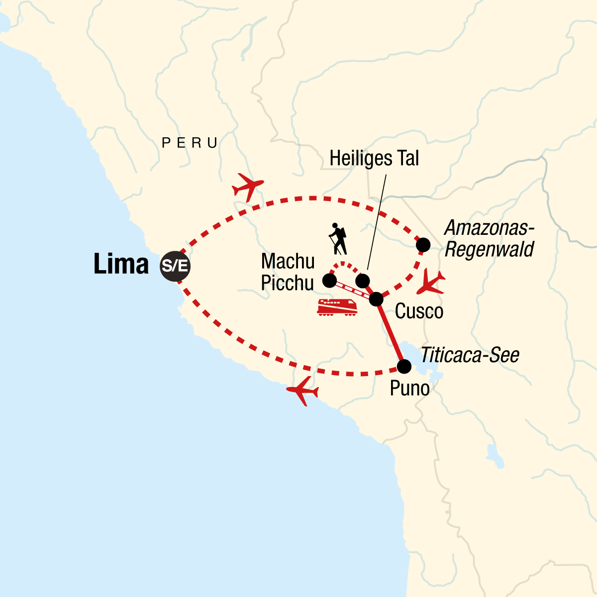 In Peru warten Abenteuer an jeder Ecke, von den grünen Tälern und schroffen Gipfeln der Anden bis zum glitzernden Ufer des Titicaca-Sees. Auf dieser actionreichen Reise besuchen wir die legendärsten Sehenswürdigkeiten des Landes. Wir übernachten in einer Dschungel-Lodge im Amazonas und entdecken im Heiligen Tal faszinierende Inka-Ruinen und uralte indigene Traditionen. Du kannst eine der legendärsten Wanderungen der Welt – den Inka-Trail – gehen oder die spektakuläre Zugfahrt zur legendären Ruinenstadt Machu Picchu machen. Danach geht es durch die raue und wunderschöne Landschaft des Altiplano zum Titicaca-See, dem höchstgelegenen schiffbaren See der Welt