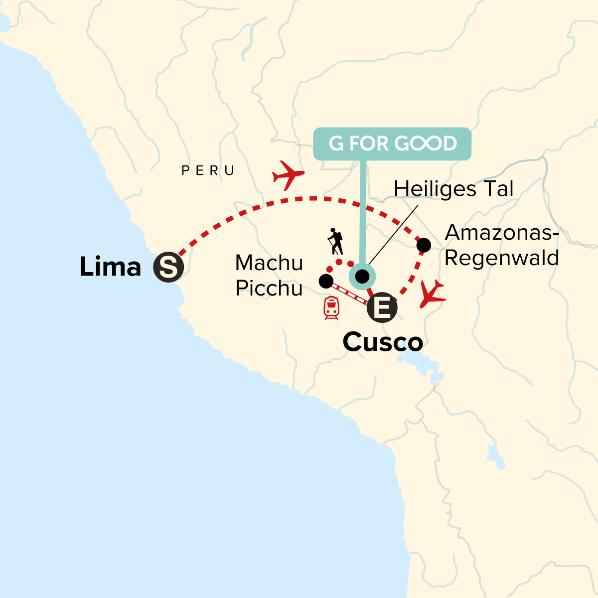 Dein G-for-Good-Moment: Biologisch abbaubare Produkte. Ankunftstransfer. Dreitägiger Ausflug (2 Übernachtungen) zur Regenwald-Lodge von G Adventures. Tour im Heiligen Tal. Entweder viertägige Inka-Trail-Wanderung mit lokalem Guide und Trägern oder Aufenthalt in Cusco/Aguas Calientes und malerische Zugfahrt. Geführte Besichtigung von Machu Picchu. Inlandsflüge. Alle Transfers zwischen besuchten Orten sowie zu inbegriffenen Aktivitäten und zurück