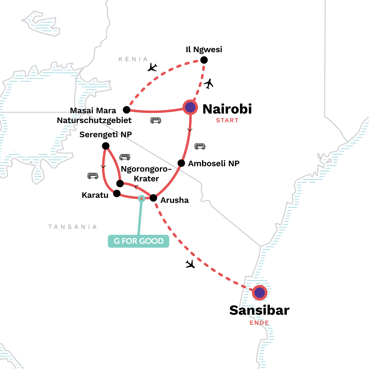 Dein Discover-Moment: Nungwi. Complimentary Arrival and Departure Transfers. Welcome and Farewell dinners. Safari drive near Il Ngwesi Lodge. Bush walk with a Maasai guide. Safari drive in the Maasai Mara Reserve. Tree Planting Experience. Bush dinner. Internal flight between Nairobi & Il Ngwesi Lodge. Internal flight between Il Ngwesi Lodge & Maasai Mara. Amboseli National Park Safari Drive. Picnic lunch at Hippo lake. Crater Rim View Point Visit. Safari drive inside Ngorongoro Crater. Serengeti National Park safari drives. Wildlife Safari Drives near Ngorongoro Highlands. Banana Plantation Bike Ride or Village Walk on return to Arusha. Internal flight between Arusha & Zanzibar. Stone Town walking tour. Nakupenda Beach Trip with dhow and BBQ lunch. Free day in Zanzibar. All tips included for activities and meals, except for CEO and porterage. All transport between destinations and to/from included activities