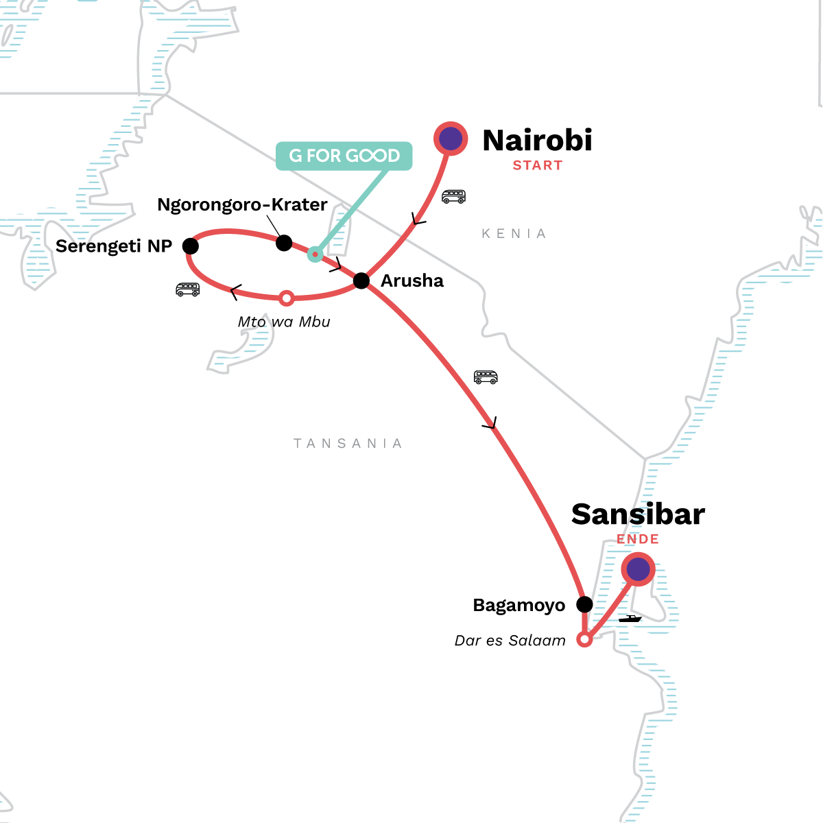 Dein Welcome-Moment: Anreise und Begrüßungstreffen. Transfer from Nairobi to Arusha. Entrances and wildlife safari drives in Serengeti National Park and in Ngorongoro Crater. Ferry to Zanzibar. Stone Town orientation walk. Beach time in Zanzibar. All transport between destinations and to/from included activities