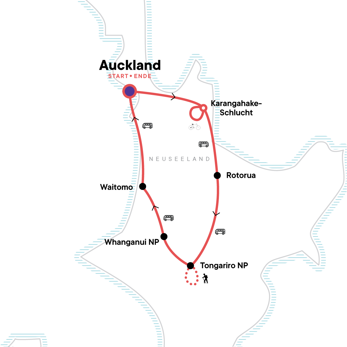Dein Welcome-Moment: Anreise und Begrüßungstreffen. Radtour durch die Karangahake Gorge. Traditionelles Hangi-Mahl. Wanderung der Tongariro-Alpenüberquerung (wetterabhängig). Fahrt mit dem Jet-Boot auf dem Whanganui River. Zeit in Rotorua und Waitomo zur freien Verfügung. Alle Transfers zwischen den Reisezielen sowie zu inbegriffenen Aktivitäten und zurück