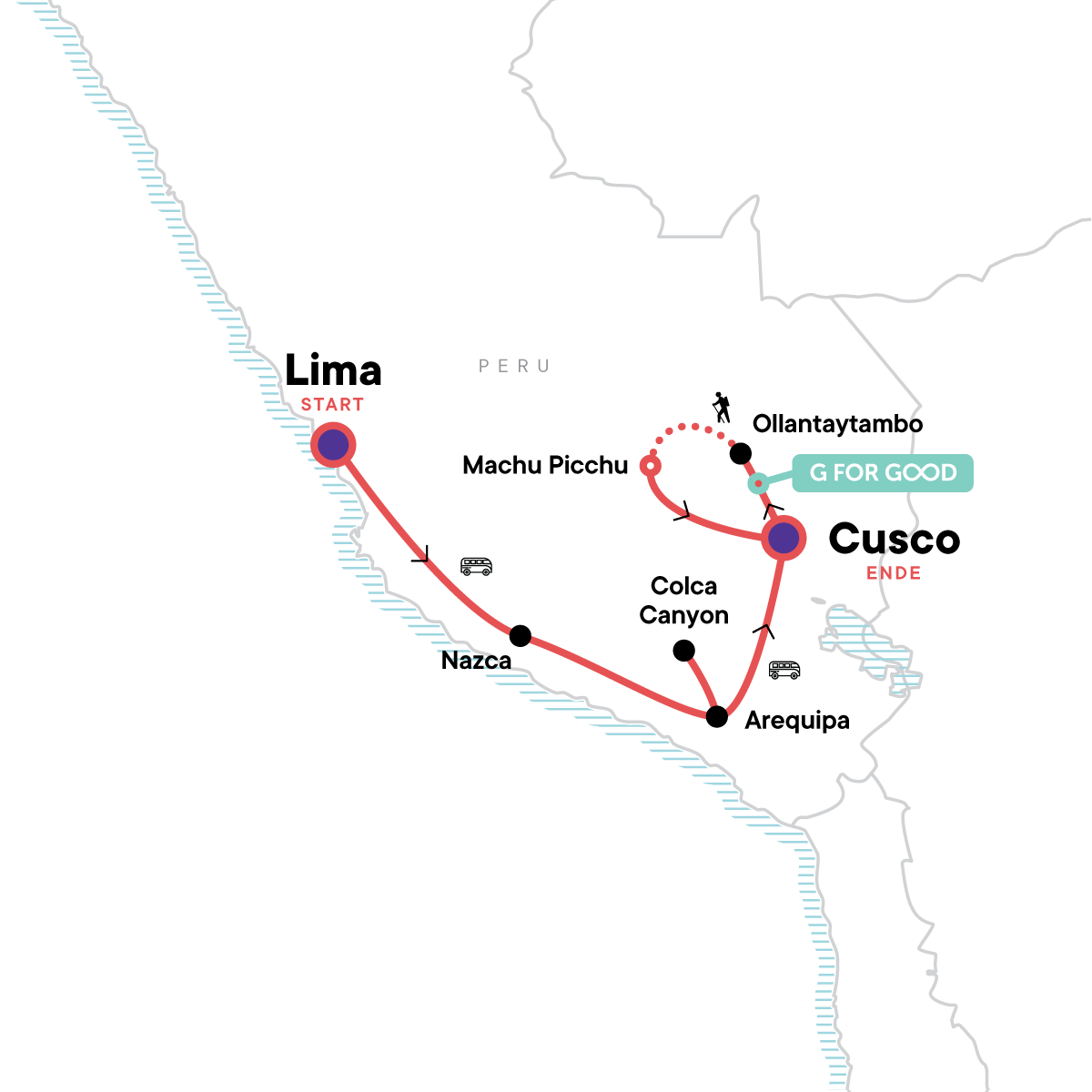 Wandere auf dem legendären Inka-Trail zur verlorenen Stadt Machu Picchu im Nebelwald, erlebe ein traditionelles Essen und ein Pachamanca-Fest oder mach einen optionalen Rundflug über die Nazca-Linien – du hast die Wahl; dies ist dein Abenteuer! Dein CEO (Chief Experience Officer) kümmert sich um Unterkunft und Transport, damit du dich ganz auf deine persönlichen Entdeckungen konzentrieren kannst. Eine 14-tägige Erlebnisreise wie ein tolles (Spar-)Buch – voller Highlights und Flexibilität, kompakt und nicht zu teuer. Ganz Peru liegt dir zu Füßen!