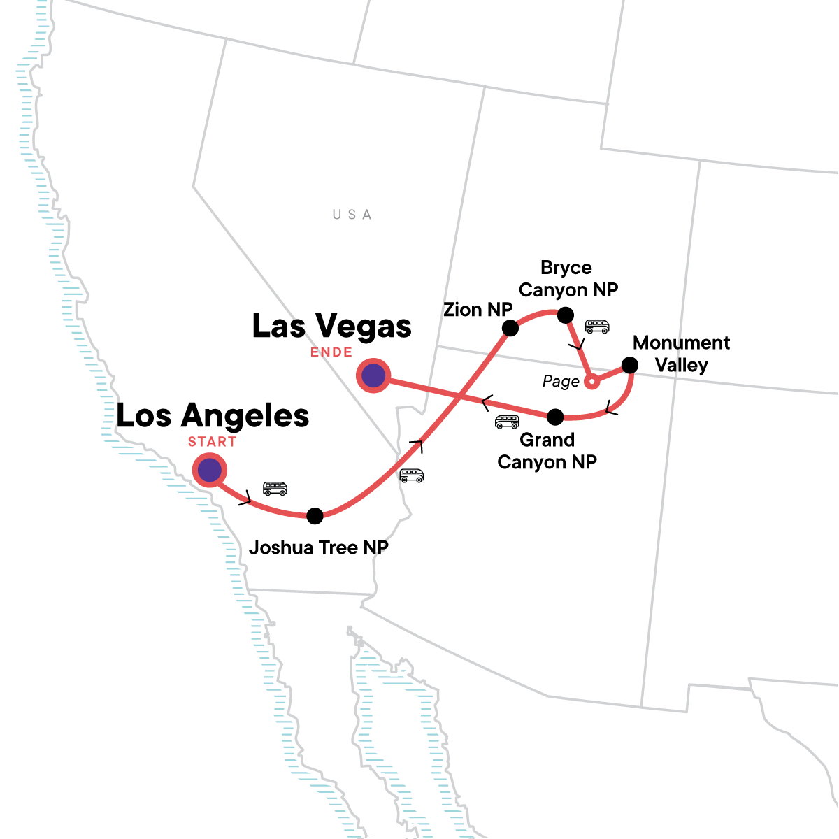 Tank deine Batterien auf und erweitere deinen Horizont bei dieser Erlebnisreise durch vier der besten Nationalparks der USA. Cruise auf der berühmten Route 66, bewundere die wilden Felsformationen in Joshua Tree, sieh eine der legendärsten Landschaften der Welt hautnah am Rand des Grand Canyons, wandere zwischen den bizarren Hoodoos im Bryce Canyon und erlebe den Zauber von Zion von oben. Du musst einfach nur die Natur und die frische Luft genießen. Um alles andere kümmern wir uns.