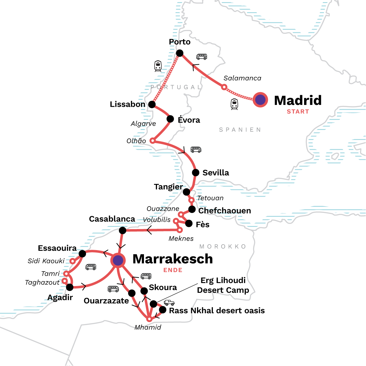 Pack your bags for an unforgettable 26-day adventure through Spain, Portugal, and Morocco-where every day is a feast for the senses. Start in Madrid, soaking up Spanish culture before heading west to Portugal's stunning coastline. Wander charming streets, sip Port wine in a traditional cellar, and take in the soulful sounds of Fado. Then, hop back to Spain for a fiery Flamenco performance before crossing the Strait of Gibraltar into Morocco, where a whole new world awaits. Snap photos in Chefchaouen's mesmerizing blue-washed alleys, get lost (but not really) in Féz's labyrinth-like medina, and stand in awe of Casablanca's grand architecture. Venture into the Sahara for sandboarding, stargazing, and fresh-baked bread straight from the desert sand. End your journey on Morocco's breezy coast, where souks, surf, and sunset views wrap up this perfect blend of culture, history, and adventure.
