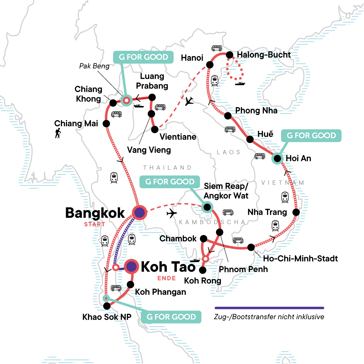 Erlebe Thailand, Kambodscha, Vietnam und Laos jetzt mit uns auf deine Weise mit diesem erschwinglichen Trip speziell für junge Reisende! Tausche zwischen den Marktständen von Siem Reap bei einem Drink Geschichten mit deinen Mitreisenden aus, erlerne die hohe Kunst der Nudelherstellung in Hoi An und genieße die letzten Sonnenstrahlen des Tages inmitten der glitzernden blauen Wellen von Ko Pha-Ngan. Dieses 40-tägige Abenteuer bietet viel Zeit, um deinen Puls mit diesem Teil Südostasiens in Einklang zu bringen - und du wirst sicherlich für mehr dorthin zurückkehren.