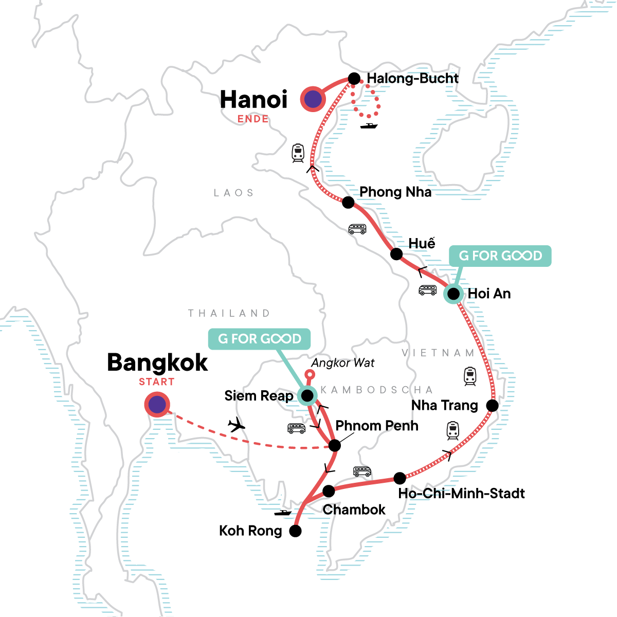 Erlebe Kambodscha und Vietnam jetzt mit uns auf deine Weise mit diesem erschwinglichen Trip speziell für junge Reisende! Stürze dich ins pulsierende Leben in den Straßen von Bangkok und Kambodscha, erlebe eine unvergessliche Geschichtsstunde zwischen den steinernen Gesichtern in Angkor Wat und chille an paradiesischen weißen Sandstränden. Was bekommst du, wenn du die größten Sehenswürdigkeiten mit freier Zeit für eigene Entdeckungen kombinierst? Die Südostasienreise deines Lebens!