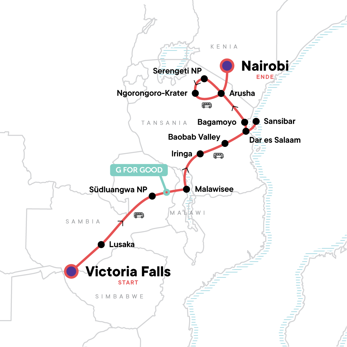 Folge in wendigen Safariwagen den Spuren der „Big Five“ durch die Serengeti und den Ngorongoro-Krater, relaxe am Malawisee, entdecke die Victoriafälle und Sansibar